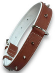Нашийник для собак виготовлений із натуральної ремінної шкіри завширшки від 30 мм до 40 мм.. Шкіряний нашийник для собак прикрашений Шипами. Під час виготовлення нашийника для собак застосовується найм'якша шкіра. Для додаткової надійності нашийник підшитий у два шари шкіри. Фурнітура українського виробництва. Шкіряні нашийники мають півкільце, за яке пристібається повідець. У виробництві використовуються тільки зварні півкільця. Нашийник із натуральної шкіри для собак має пряжку — надійна застібка, що запобігає випадковому розстібанню. Місця з'єднання укріплені прошиті нейлоновою ниткою.